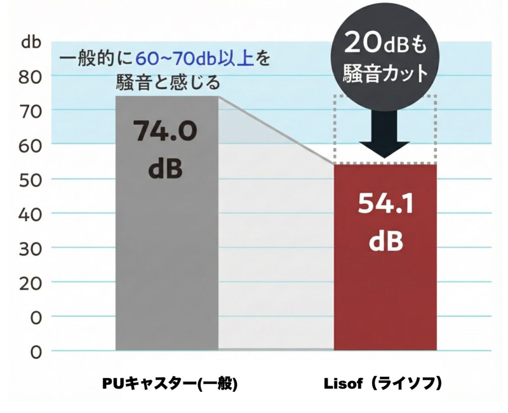 硬いタイヤが路面を叩く音が「ガラガラ」という騒音の原因となりますが、Lisofは路面に吸い付くように転がるため、体感音量を大幅に下げることに成功しました。