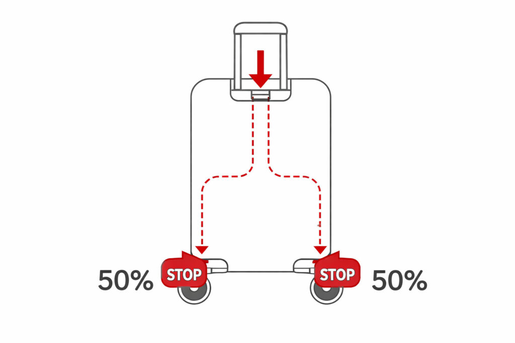 また、座席に座っている時は自分の足の間に本体を挟む、あるいは壁や柱にキャスターを押し当てるように配置するだけでも十分な制動力が得られます。
