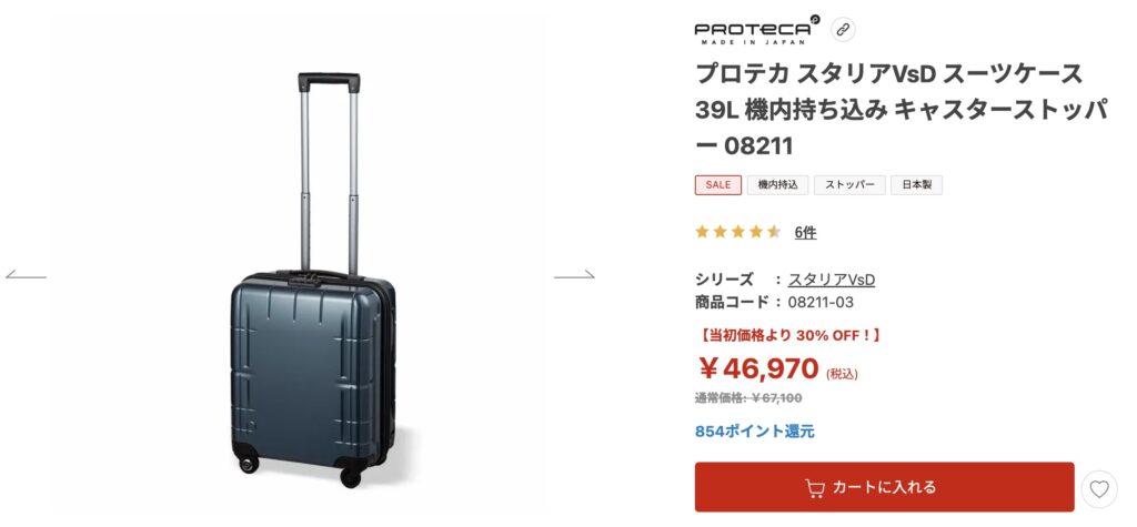 例えばキャスターストッパーで有名なACEのプロテカなど、39L容量の機内持ち込みスーツケースが、¥46,970(税込)もします。